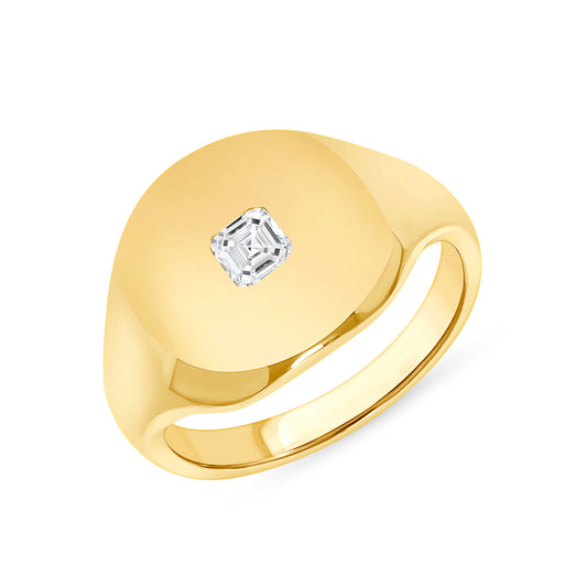 Our unisex Asscher Diamond Ring has gained a lot of popularity as a pinky ring but can be worn however you fancy. The center stone is larger than photographed at approximately 3.6mm-4mm. The clarity we use is always VS1-VS2 colorless earth mined diamond. Our CMJ Lifetime Warranty is always implemented in every CMJ piece.